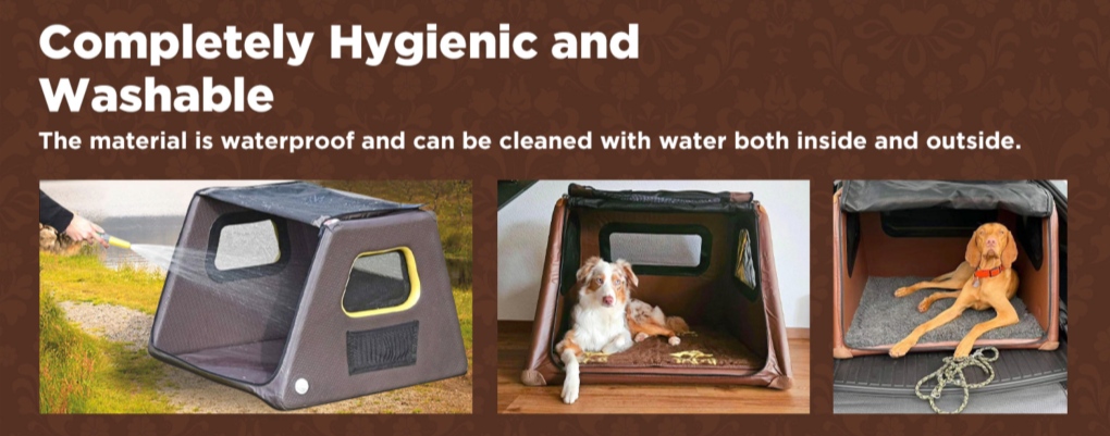 2. ENTIRE OUTSIDE&INSIDE WATERPROOF WASHABLE: This foldable dog crate outdoor can be completely cleaned with water both outside and inside. Unlike the traditional oxford cloth soft dog crate, there is absolutely no cloth or steel pipe for this travel dog crate, this large dog crate is entire outside and inside waterproof/resistant, stops any leak when the puppy peed. Water-repellent material makes the folding dog crate easy to wipe down and no mess.